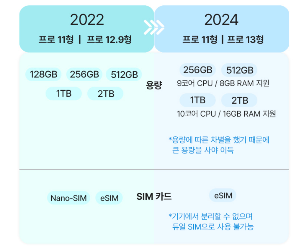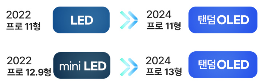 | 2022 프로 11형 | 2024 프로 11형 | 2022 프로 12.9형 | 2024 프로 13형 | |