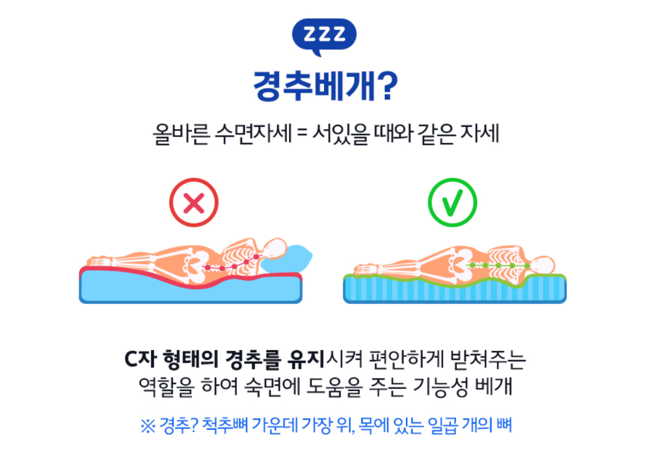 경추베개는 올바른 수면 자세를 유지시켜주는 기능성 베개입니다. 올바른 수면자세란 서있을 때와 같은 자세를 의미합니다. C자 형태의 경추를 편안하게 받쳐서 자연스럽게 유지시켜주는 역할을 하여 숙면에 도움을 줍니다. 대표적인 효과는 아래와 같습니다.