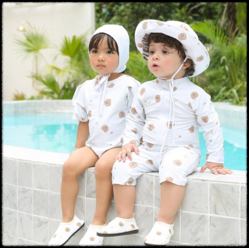 베베코지 둘 아기 수영복 래쉬가드 세트는 유아들의 민감한 피부를 자외선으로부터 보호하는 데 최적화된 제품입니다. 귀여운 곰돌이 패턴이 특징인 이 세트는 여아와 남아 모두 착용할 수 있는 제품입니다. 래쉬가드와 바지, 모자로 구성되어 있습니다.