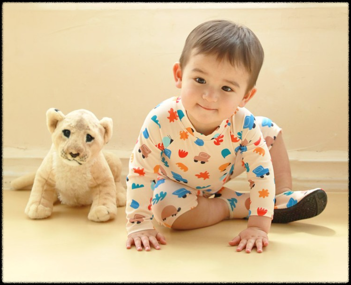 폴리에스터와 폴리우레탄 혼용 소재로 제작되어 신축성이 뛰어나고, 아기의 피부에 자극을 주지 않는 부드러운 감촉을 자랑합니다. 또한, 신축성 있는 소재 덕분에 아기들이 자유롭게 움직일 수 있어 편안합니다. UPF 50+ 자외선 차단 기능을 갖추고 있어 강한 햇빛 아래에서도 안전하게 사용할 수 있습니다. 모자와 함께 제공되어 아기의 얼굴과 목을 보호할 수 있으며, 신발도 포함되어 있어 발까지 완벽하게 보호할 수 있습니다.