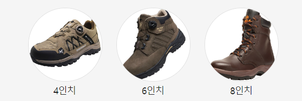 일반적으로 안전화의 종류는 발목높이에 따라 4인치, 6인치, 8인치로 분류합니다. 따라서 사용하는 직군이 어디인지 보시고, 목적과 용도에 맞게 안전화를 고르시는 것이 중요합니다.
