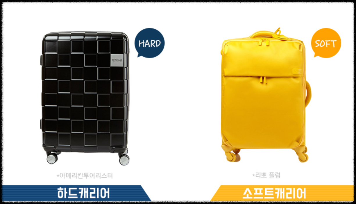캐리어의 목적을 정하셨다면, 다음은 재질을 정해야 됩니다. 캐리어는 딱딱한 소재로 만든 것과 푹신한 소재로 만든 캐리어 두 가지가 존재하며 각각의 장단점은 아래와 같습니다.