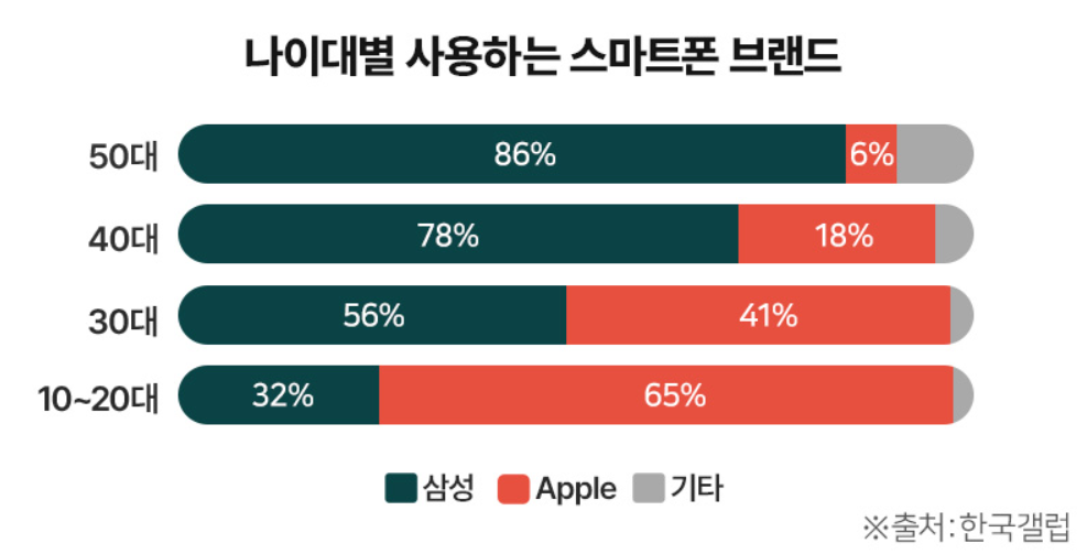 10~20대 기준에서는 65% 이상이 아이폰을 선호하는데 반해 삼성 갤럭시 모델은 32%을 비율에 그쳤습니다. 하지만, 30대에서는 삼성 갤럭시 56%, 애플 아이폰 41%로 삼성 갤럭시가 우세한 반응이 나왔습니다. 그렇기 때문에 아이폰을 선물하거나 구매하는 연령은 10~30대가 가장 많은 것으로 나타나 있습니다.