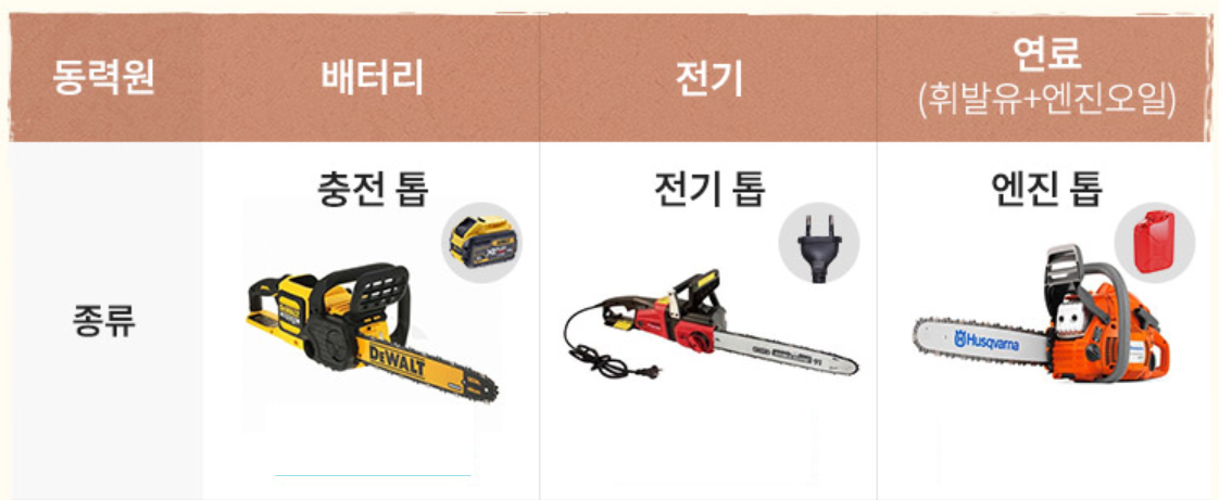 체인톱이란 체인형 톱날을 장착한 공구를 고속회전시켜 사용하는 절단을 위한 전용 공구로, 동력원에 따라 충전톱, 전기톱, 엔진톱으로 나눌 수 있습니다. 따라서, 체인톱을 구매할 때는 내가 어떠한 동력원을 사용할 것인지 선택한 후 구매하는 것이 중요합니다.