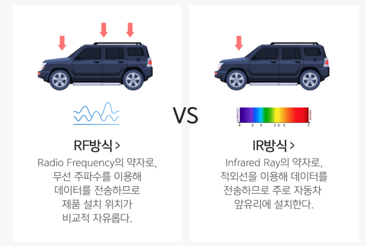 하이패스 단말기 작동 방식 또한 2가지 입니다. RF와 IR 방식이 있으며, 각각의 장단점이 존재하므로 목적과 상황에 맞게 구매하는 것이 중요합니다.