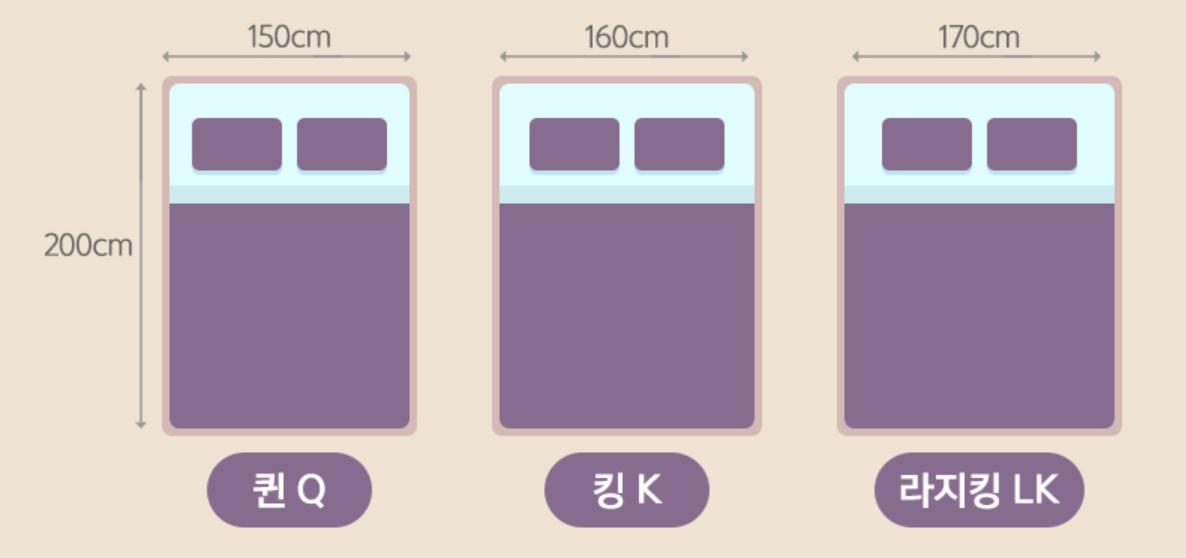 1인용으로 사용하는 싱글 또는 슈퍼싱글 외에 2인이 사용하는 매트리스 표준 규격은 퀸Q, 킹K, 라지킹LK이 있습니다. 표준규격은 아래와 같지만 인기브랜드별로 조금씩 매트리스 사이즈가 차이나기도 합니다.